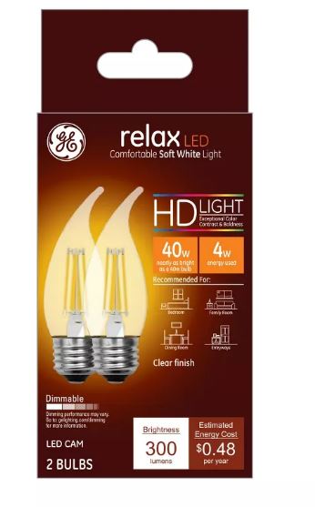 La bombilla decorativa CAM de repuesto LED HD Relax Soft White LED de 40 vatios de GE ofrece una eficiencia energética excepcional, un rendimiento duradero y un contrato de color excepcional y audaz, todo en un solo paquete. Ofrece una luz cálida y suave perfecta para momentos confortables y espacios acogedores. Utilice la luz relajante en espacios como dormitorios, salas familiares y comedores. Calificado para durar 13 años en base a 3 horas de uso por día, el LED de GE ahorra $59 en costos de energía durante la vida nominal de la bombilla a $0,11 kW/h en comparación con un CAM incandescente de 40 vatios. Utilice la bombilla decorativa HD Relax Soft White LED de 40 vatios de repuesto CAM con punta doblada y base media de GE en candelabros, colgantes, candelabros y más para resaltar la belleza de la lámpara.