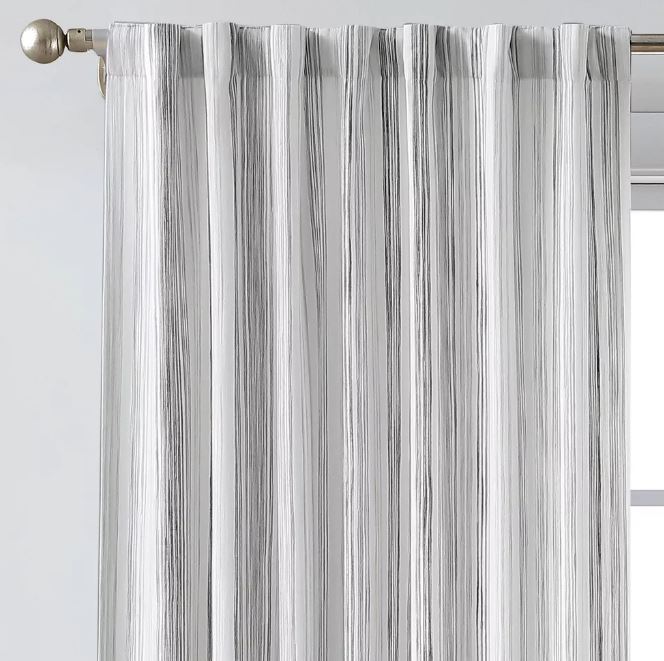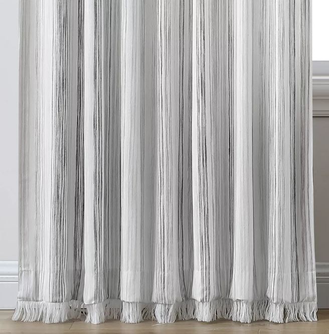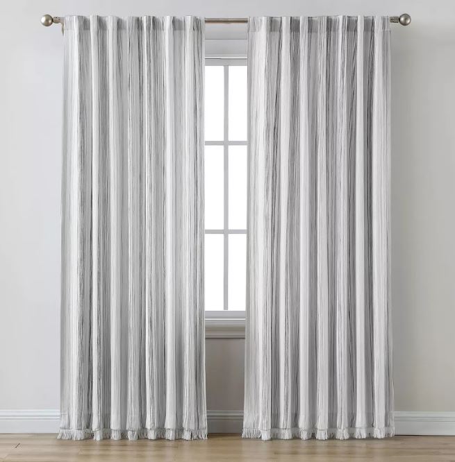 Decore sus ventanas con un estilo divertido con este panel de cortina filtrante de luz con rayas grises de Threshold™. Adornado con rayas verticales tejidas en tonos neutros con acentos de flecos a juego para una apariencia decorativa, este panel de cortina a rayas está confeccionado con una tela que filtra la luz y deja pasar la cantidad justa de luz natural. La construcción de tela liviana y la lengüeta trasera, el bolsillo para barra en la parte superior permiten colgarlo y quitarlo fácilmente, y el diseño lavable a máquina facilita el mantenimiento. Colgada en la sala de estar, el dormitorio o el dormitorio de invitados, esta cortina que filtra la luz aporta funcionalidad y estilo a cualquier habitación de su hogar.