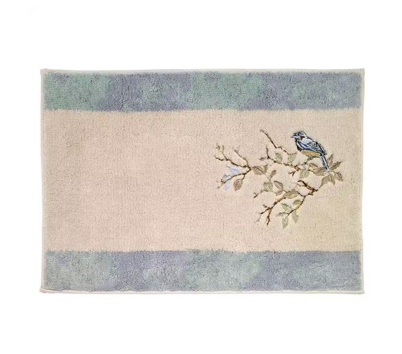 La alfombra Avanti Love Nest está confeccionada en 100% algodón y tiene un pájaro bordado descentrado posado en una rama. La alfombra de color marfil tiene un borde superior e inferior con un borde azul a juego. La parte trasera antideslizante ayuda a prevenir deslizamientos y resbalones. Importado.