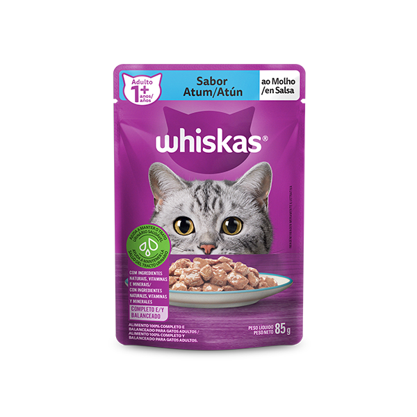 La receta de los sobres Whiskas Atún le ofrece a tu gato deliciosos trocitos de carne cocidos al vapor que le otorgan fibras naturales y minerales, Vitamina A y Taurina que benefician integralmente su salud.