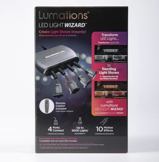 Organice un deslumbrante espectáculo de luces navideñas con Lumation® LED LightWizard™. Conecte sus luces a los cuatro puertos del LightWizard y observe cómo pasan de estáticas a dinámicas. LightWizard tiene 10 efectos de movimiento preprogramados y sincroniza una pantalla para hasta 8000 luces LED. Con la función de temporizador del control remoto, puedes activar y disfrutar del LightWizard con facilidad. Crear un increíble espectáculo de luces navideñas nunca ha sido tan fácil.