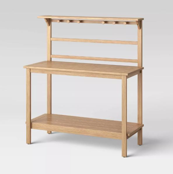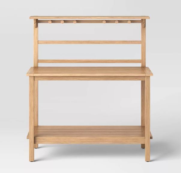 Este bar/cobertizo para patio Bluffdale de Threshold™ diseñado con Studio McGee es una pieza versátil imprescindible para su patio, terraza o cobertizo. Con una estructura de madera de eucalipto en un tono de madera cálido, esta cabina con una mesa superior y un estante inferior se puede utilizar para servir bebidas y alimentos o como espacio de trabajo de jardinería. Además, incluye seis pomos de madera en la parte superior para colgar herramientas o secar flores. El estilo atemporal de este bar/cocina le permite combinarse sin esfuerzo con su decoración exterior existente.