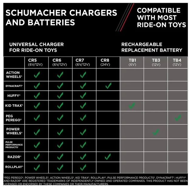 No dejes que una batería agotada acabe con la diversión de tu pequeño. Haga que su hijo vuelva rápidamente al volante de sus juguetes para montar favoritos con la batería de repuesto recargable Schumacher Charge ‘n Ride TB3 de 12 voltios. Tener una batería cargada adicional a mano mantiene el tiempo de juego bajo control. El TB3, una batería recargable de 12 voltios y 9,5 Ah de capacidad, está diseñado para hacer funcionar juguetes para montar de 12 voltios de Fisher-Price y Power Wheels. Esta batería de repuesto se puede recargar con el cargador suministrado por Fisher-Price o Power Wheels. Sin embargo, para obtener mejores resultados, utilice el cargador universal Schumacher CR7 de 3 amperios, 6 voltios/12 voltios para juguetes para montar. Nuevo en caja.