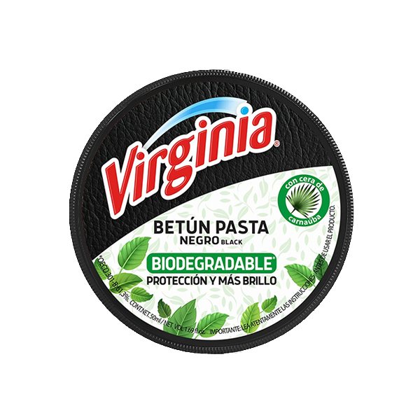 Betún Pasta Virginia a base de ceras vegetales y cera de abeja, cuida la piel del calzado, la nutre, protege e impermeabiliza, proporcionando un brillo intenso. Ideal para ser usada sobre cuero de color negro.