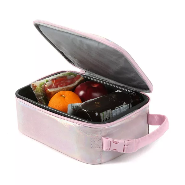 El interior cuenta con un revestimiento duro con un divisor ajustable diseñado para mantener los alimentos blandos como sándwiches separados de los elementos duros como recipientes para alimentos o bebidas. El revestimiento y el divisor son extraíbles para que pueda colocar recipientes bento de tamaño estándar de hasta 9 x 6,5″ dentro de la lonchera.