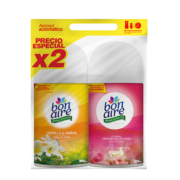 Repuesto x2 de aerosol automático. Fragancia Floral & Vainilla. Solo intercambialo en tu dosificador automático.