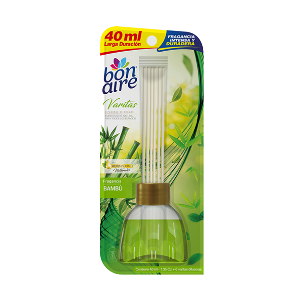 Bon Aire Varitas es un ambientador decorativo de sutiles palitos de madera, que al absorber un aceite perfumado, expanden su exquisito aroma por todo el lugar.