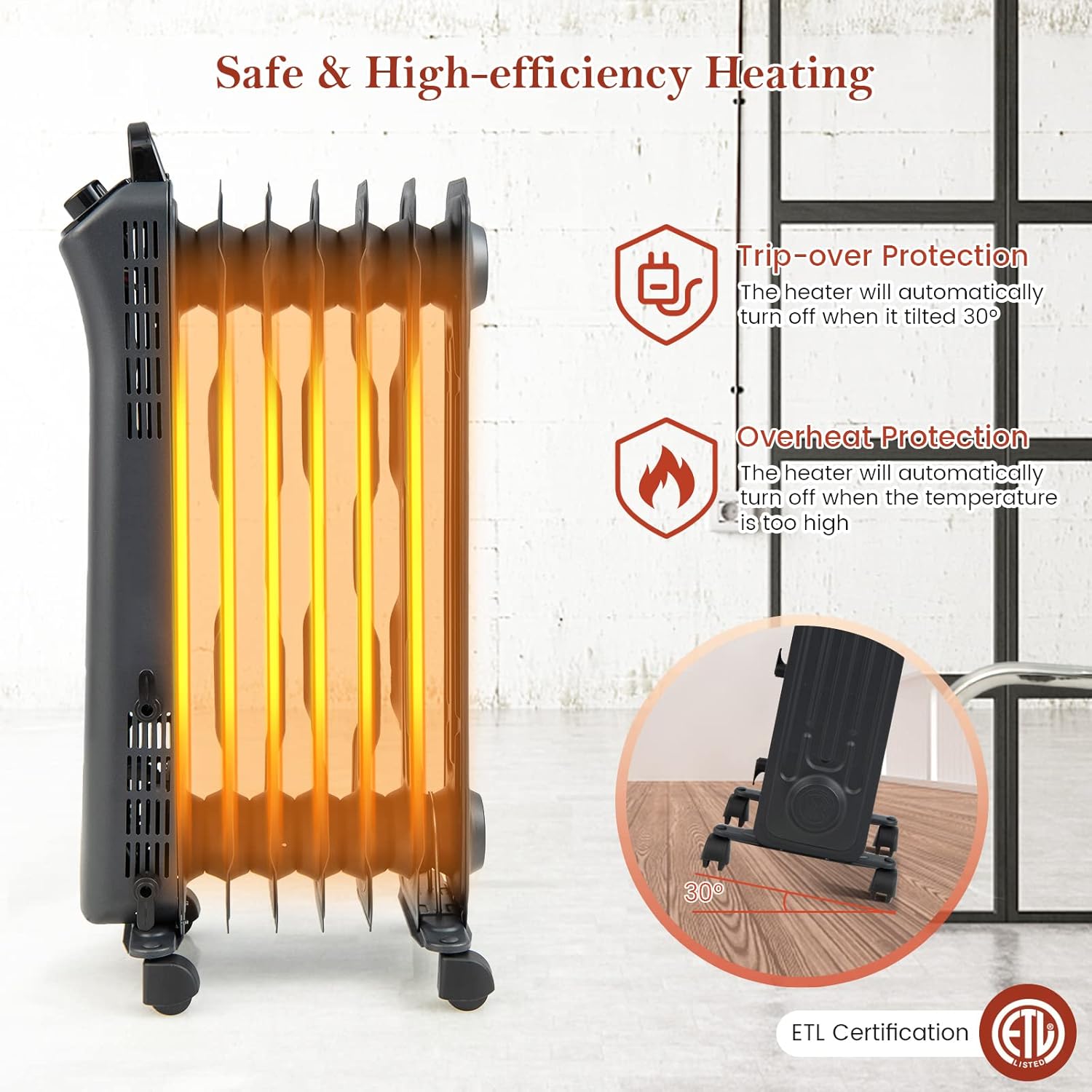 Múltiples protecciones seguras: Con protección contra sobrecalentamiento y vuelco, este calentador lleno de aceite no solo se apaga automáticamente si accidentalmente se inclina sobre 30° a 60°, sino que también se apaga cuando la temperatura es demasiado alta. Además, el material resistente al fuego V0 y la certificación ETL añaden seguridad adicional.