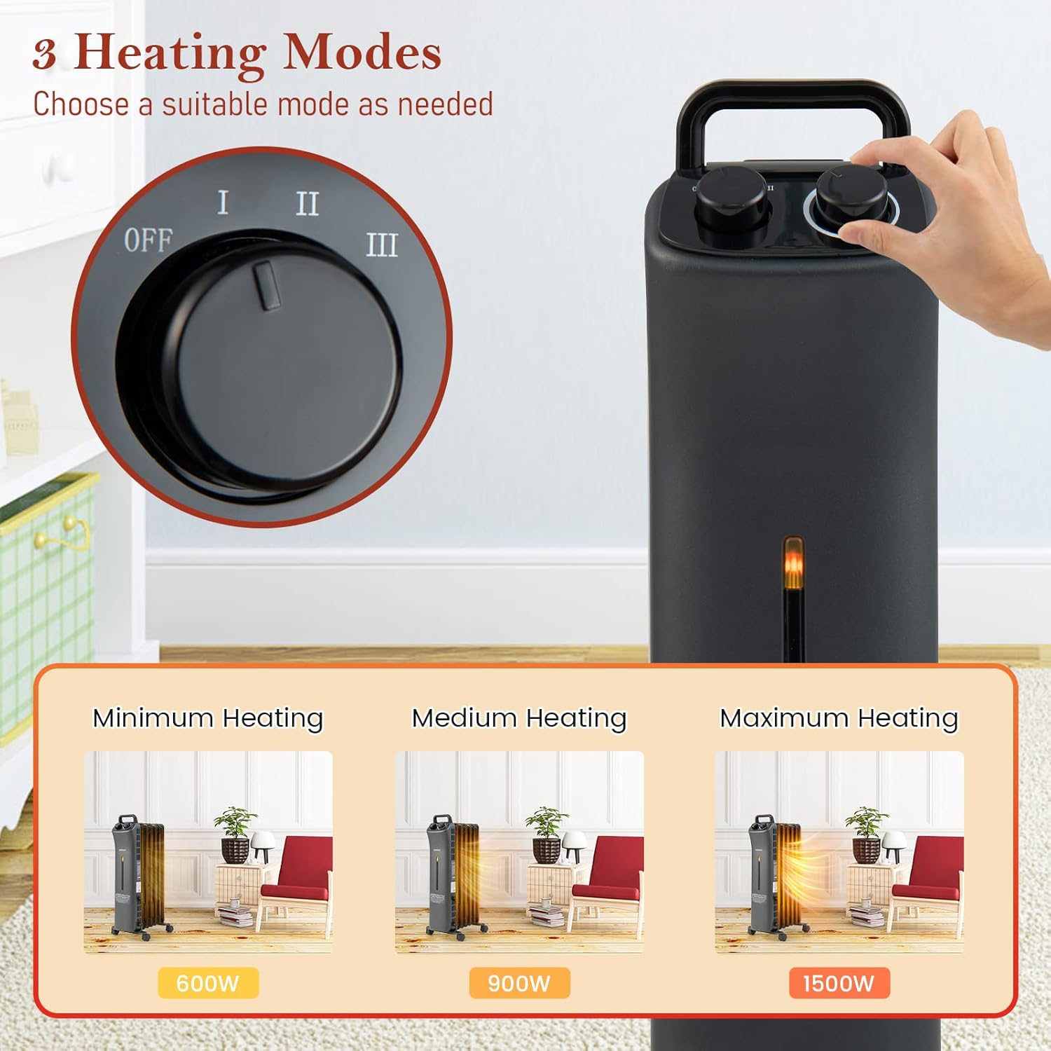 3 modos de calefacción y termostato ajustable: gracias a sus 3 ajustes de calor con 600 W/900 W/1500 W, este radiador eléctrico lleno de aceite con 7 aletas de calefacción ofrece calefacción de alta eficiencia. Con el termostato ajustable de 32 ℉ a 194 ℉, mantendrá la temperatura ambiente en el nivel deseado para satisfacer tus diferentes necesidades.
