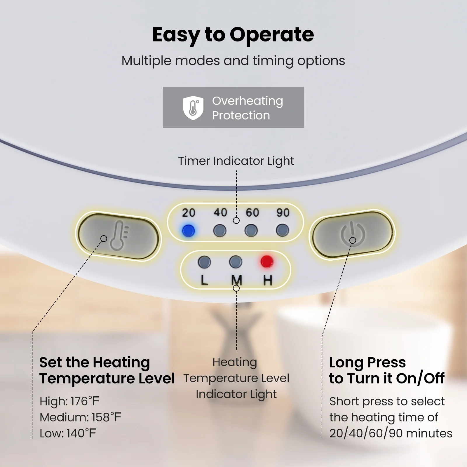 Fácil operación y seguridad mejorada: puede presionar el botón de encendido para encenderlo / apagarlo o presionar brevemente para seleccionar el tiempo de calentamiento de 20/40/60/90 minutos. La luz indicadora del temporizador y la luz indicadora del nivel de temperatura de calentamiento le mostrarán claramente la configuración actual. Además, el calentador de toallas cuenta con protección contra el sobrecalentamiento para un uso seguro.