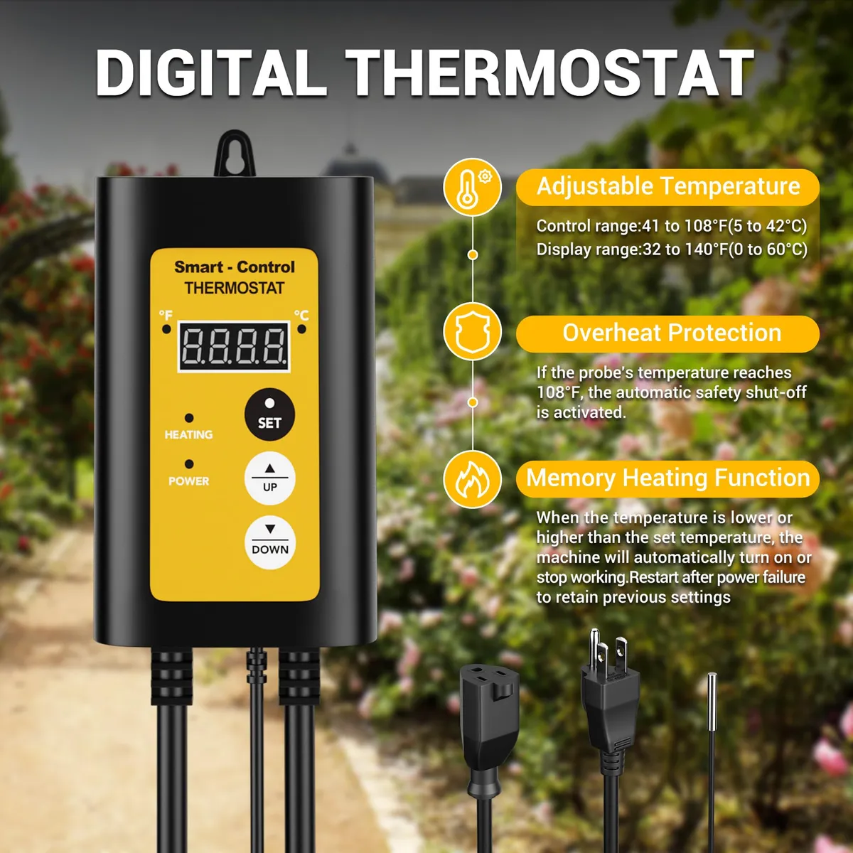 Con protección contra sobrecalentamiento: cuando el calentador de invernadero alcanza una cierta temperatura de sobrecalentamiento durante un largo período de tiempo, el sistema apaga automáticamente el calentador y lo reinicia cuando la temperatura se ha enfriado. Esto evita daños causados por el sobrecalentamiento