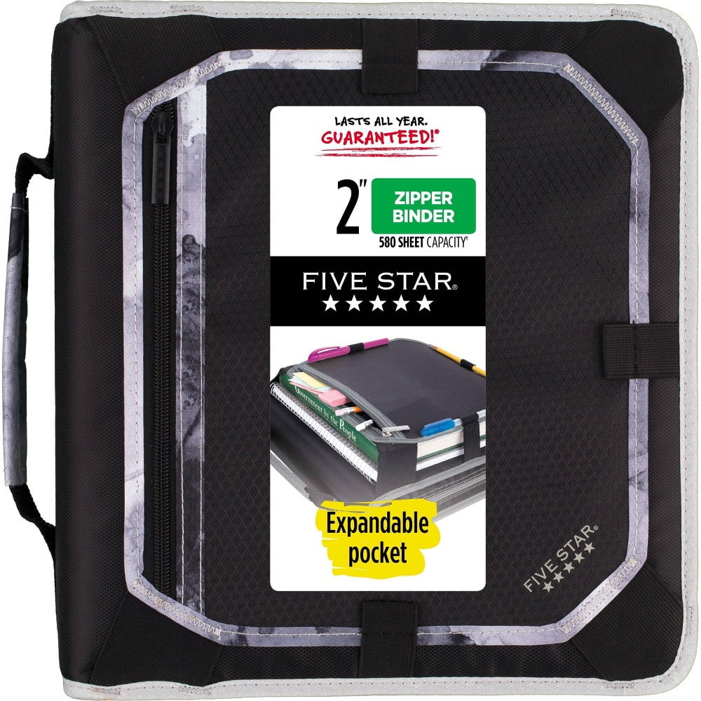 LTIMO AO. ¡GARANTIZADO! El Five Star? 2 «Zipper Binder + Panel de expansión es lo suficientemente duradero como para hacer frente a su apretada agenda. La carpeta con cremallera tiene un panel de expansión exterior para almacenar libros de texto y cuadernos sin necesidad de descomprimir para acceder. Tres anillos aglutinantes contienen 380 hojas y un archivo de expansión de 5 bolsillos contiene 200 hojas para un total de 580. Tres lazos exteriores de la pluma y bolsillo con cremallera para bolígrafos, lápices y pequeños suministros. Interior guested Velcro? bolsillo y bolsillo con cremallera de malla. Binder cuenta con asa de transporte, cierre de cremallera y cabe en una mochila.
