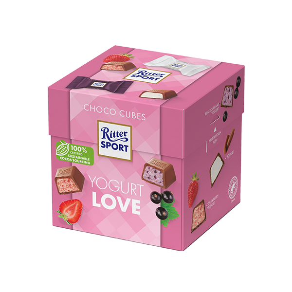 Ritter Sport choco cubos están llenos hasta el borde con sabrosas variedades de yogur. La gran mezcla de yogur de fresa y crema de frambuesa hacen que el yogur Choco Cubs sea el regalo perfecto.