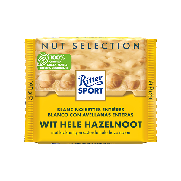 Chocolate blanco con avellanas enteras de Ritter Sport, combina la aromática manteca de cacao con toques de leche, vainilla, crujientes avellanas y arroz crujiente. Simplemente puro placer para el paladar.