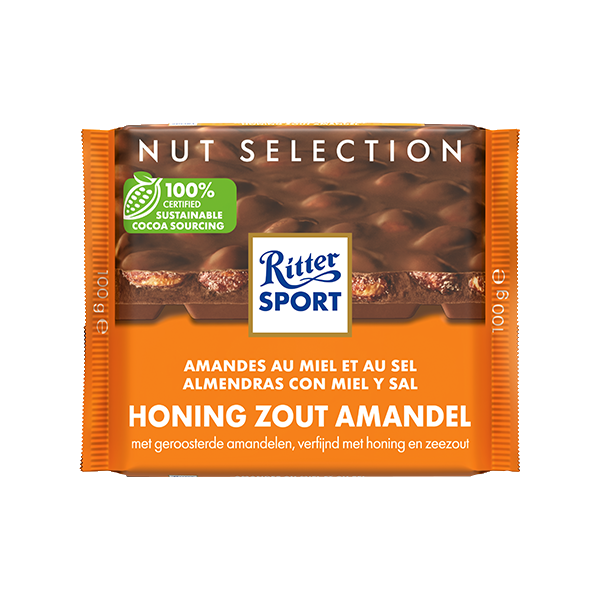 Ritter Sport almendra, miel y sal es un chocolate premium. Pero ¿qué tienen nuestras almendras con sal de miel que el otro chocolate no tiene? ¿Un poco de miel? ¿Un toque de sal? ¿Almendras enteras? Aquí hay una pista: ¡los tres! Es la combinación de estos tres ingredientes más el crujiente chocolate con leche de RITTER SPORT lo que hace que nuestras almendras con miel y sal sean tan deliciosas.