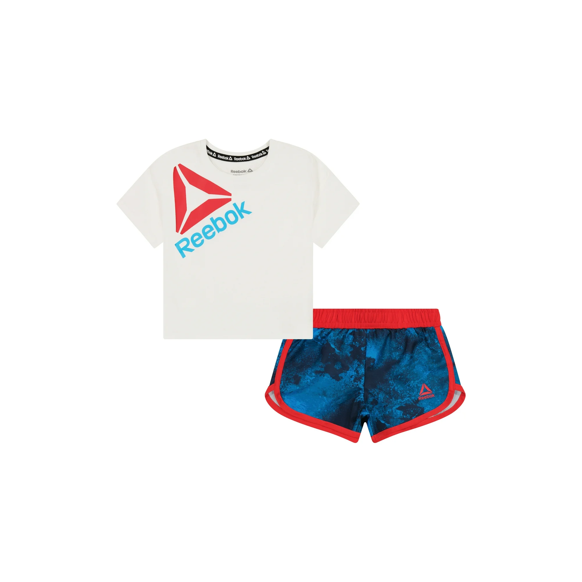 Reebok niño niñas crop tee y impreso corto 2 piezas conjunto será el equipo de go-to de su pequeño! El set presenta una linda camiseta recortada con logotipo gráfico y pantalones cortos impresos a juego, ambas piezas incluyen nuestro logotipo de Reebok Delta. Hecho de un material ligero, puede sentirse seguro sabiendo que su niña es cómoda, ya sea que la saque o se quede dentro.