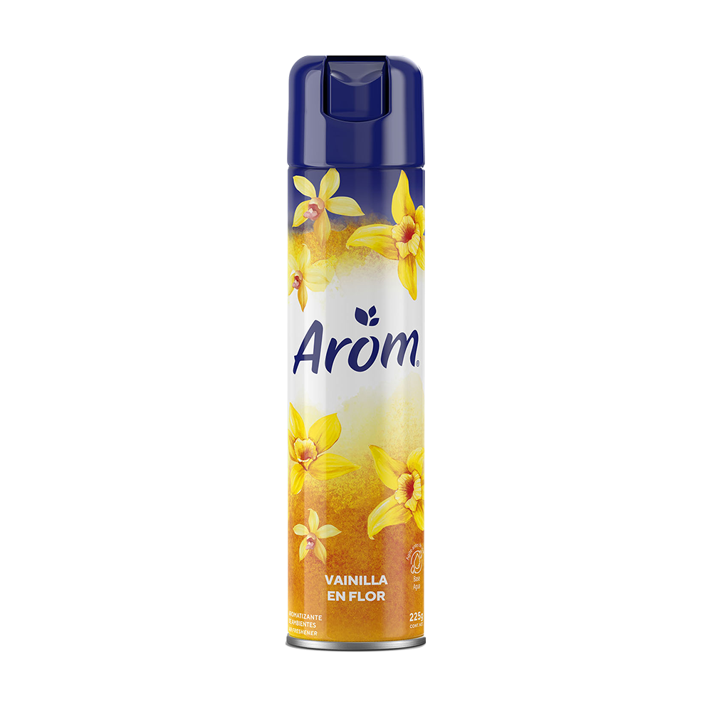 Arom desodorante ambiental en aerosol elimina olores desagradables y renueva el aire a través de finas y suaves esencias, que perfuman y desodorizan dejando una agradable y fresca sensación en el ambiente. Fórmula a base de agua. Aromas duraderos con fragancia residual.