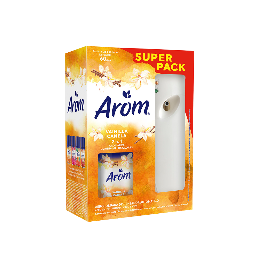 Dispensador automático temporizado y aerosol repuesto con aroma a vainilla; aromatiza y elimina olores con una larga duración y de manera continua hasta por 60 días. Puede ser colocado en cualquier área del hogar.