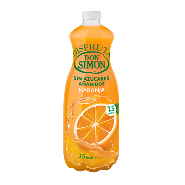 Disfruta Don Simón de naranja. Sin azúcares añadidos. Néctar de naranja bajo en calorías. Botella PET de 1,5 litros.