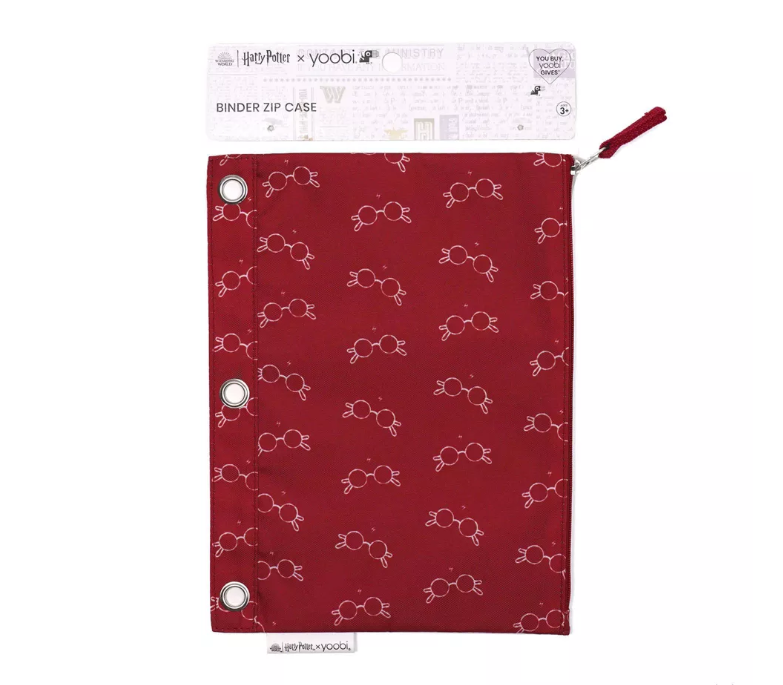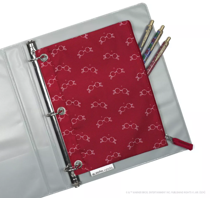 Necesitas un lugar para guardar tus bolígrafos y lápices, ¡y que sea bonito! El estuche con cremallera de Harry Potter es perfecto. El material duradero presenta los anteojos de Harry con un detalle de cremallera y tirador rojos. Los orificios de la carpeta permiten que encaje en cualquier carpeta estándar y están reforzados con anillos de metal para que dure.