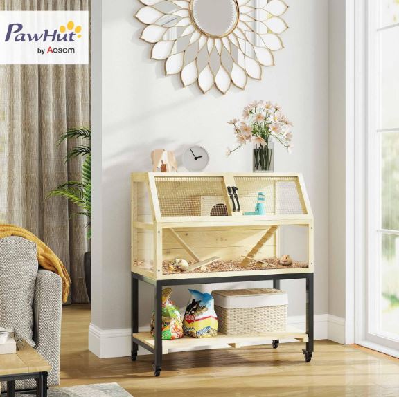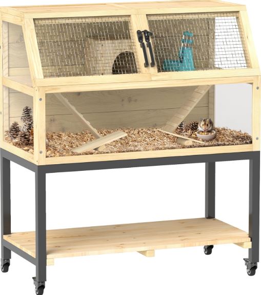 Esta amplia jaula para roedores presenta un diseño de dos niveles con amplio espacio, rampas y varios accesorios como una cabina, un balancín y una botella de agua que apoyan el comportamiento natural de los animales y aumentan su entusiasmo por la vida.