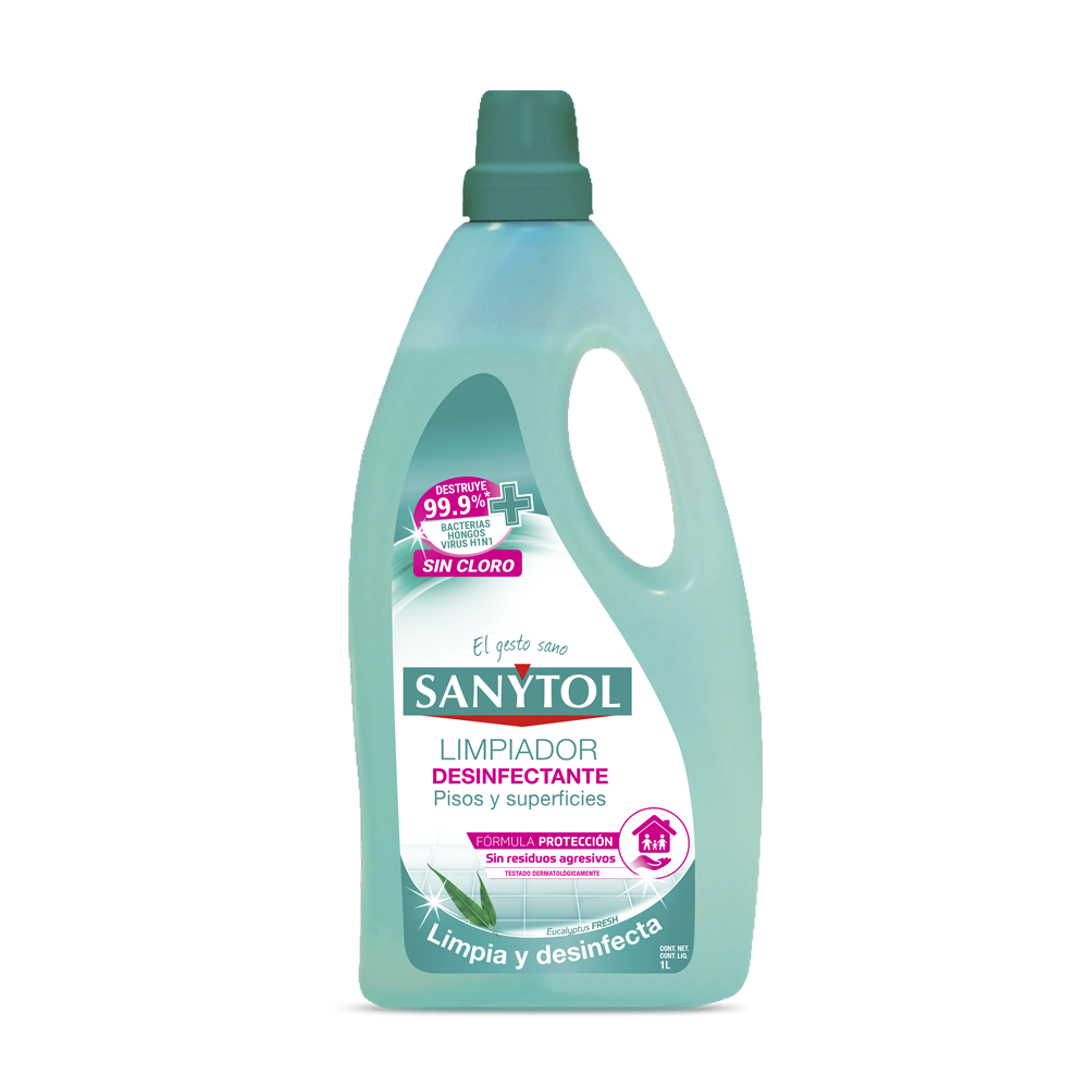 SANYTOL desinfectante multiusos limpia y desinfecta toda la casa en un solo paso y no necesita enjuague: inodoros, cubos de la basura, cajas de arena, microondas, superficies de trabajo, frigoríficos, telas, alfombras. Elimina el 99,9% de los microbios, bacterias y hongos; elimina, entre otros: el virus de la gripe A (H1N1), COVID – 19, virus del herpes, Salmonella, Listeria, Estafilococo aureus, Candida albicans, Escherichia coli, Aspergillus niger, Pseudomonas aeruginosa, Enterococcus hirae, Lactobacillus brevis. Uso diario en cualquier superficie, incluso telas. Dermatológicamente testado. Aroma refrescante a eucalipto. Fórmula SIN CLORO.