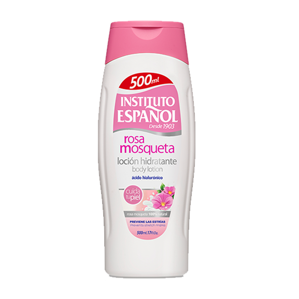La Loción Hidratante Instituto Español está enriquecida con Rosa Mosqueta y ácido hialurónico, de manera que estimula la hidratación y la elasticidad natural de la piel y ayuda a eliminar cicatrices y estrías.