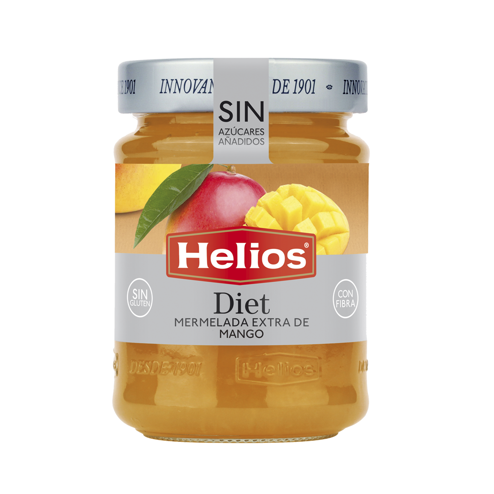 Mermelada de mango Helios elaborada sin azúcares añadidos, el sabor está en la fruta. Apta para diabéticos. Sin gluten. Con fibra.