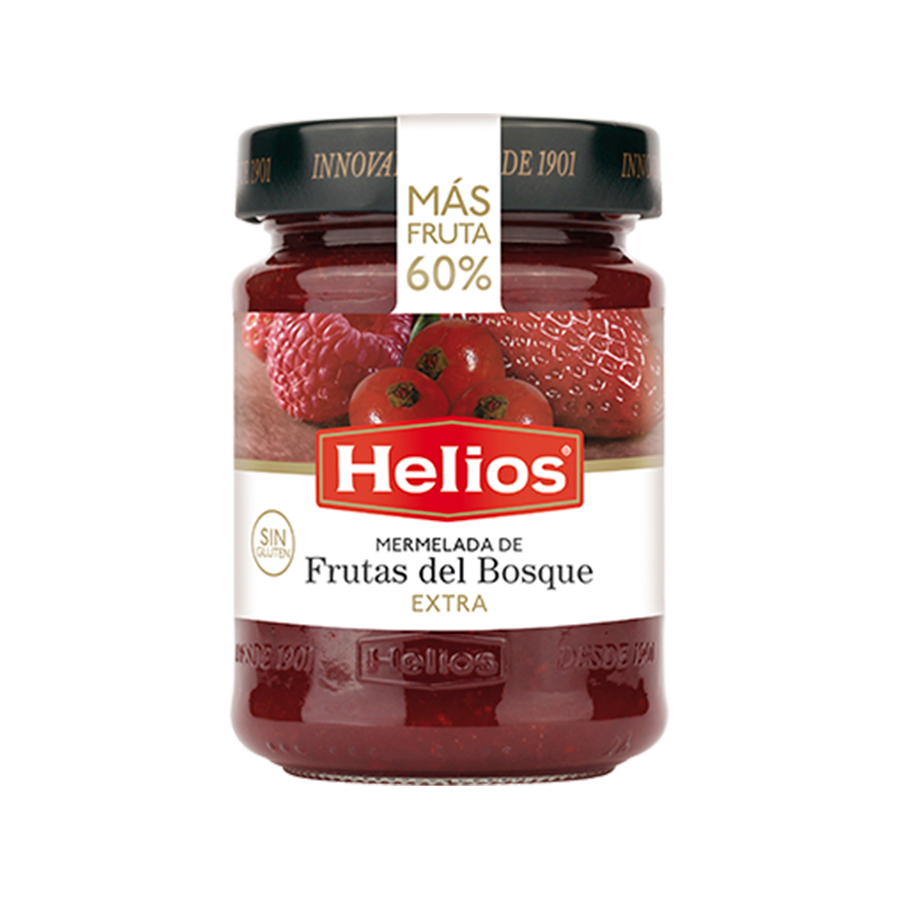 La mermelada extra frutas del bosque Helios es de fresas, frambuesas y arándanos. Contiene el 60% fruta sin colorantes ni conservadores ni gluten.