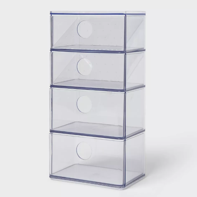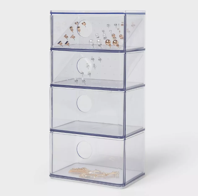 Este organizador de accesorios acrílico con cajón de Brightroom™ es una solución elegante para tu colección de joyas. Fabricado en plástico, su diseño transparente y azulado permite una mejor visibilidad y un fácil acceso a tus accesorios, manteniendo un aspecto elegante. El organizador rectangular presenta una silueta de cuatro niveles con cajones con tiradores recortados, lo que proporciona una profundidad generosa para un almacenamiento práctico.