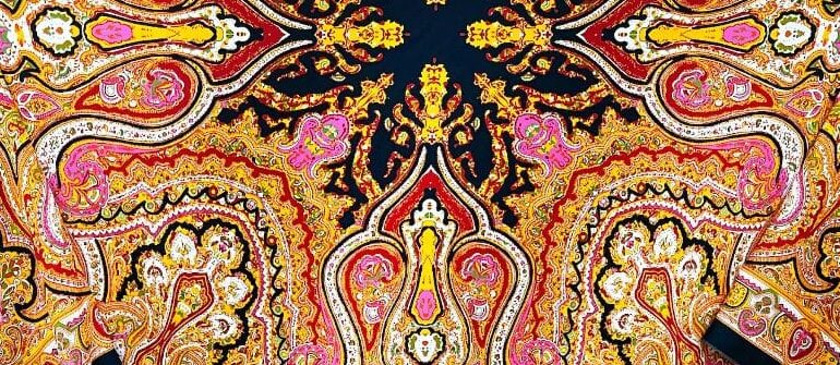 El pañuelo de cien colores se distingue perfectamente por sus cornucopias que todas terminan simétricamente haciendo un dibujo hacia el centro.