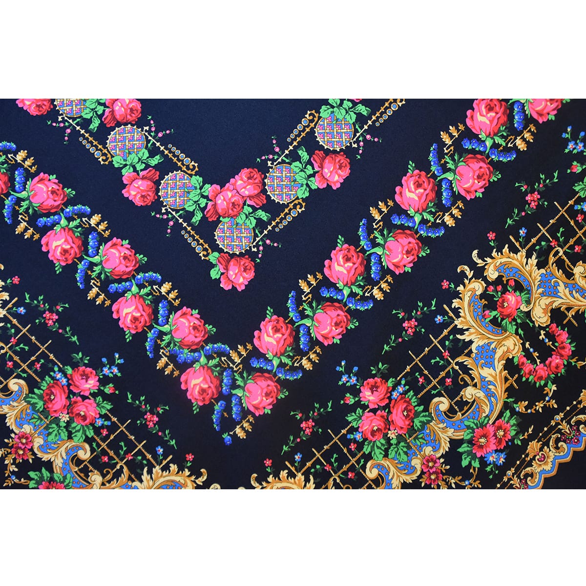 El pañuelo de cien colores se distingue perfectamente por sus cornucopias que todas terminan simétricamente haciendo un dibujo hacia el centro.