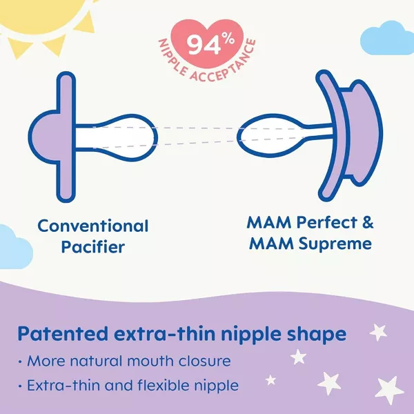 ¡Se acabó la frustración de intentar encontrar tus chupetes perdidos por la noche! Este chupete brilla en la oscuridad, lo que facilita que el bebé y los padres lo encuentren por la noche. Especialmente diseñado teniendo en cuenta los dientes y la mandíbula de tu pequeño, el chupete MAM Perfect está clínicamente probado* para reducir el riesgo de mordida abierta y sobremordida en etapas posteriores de la vida