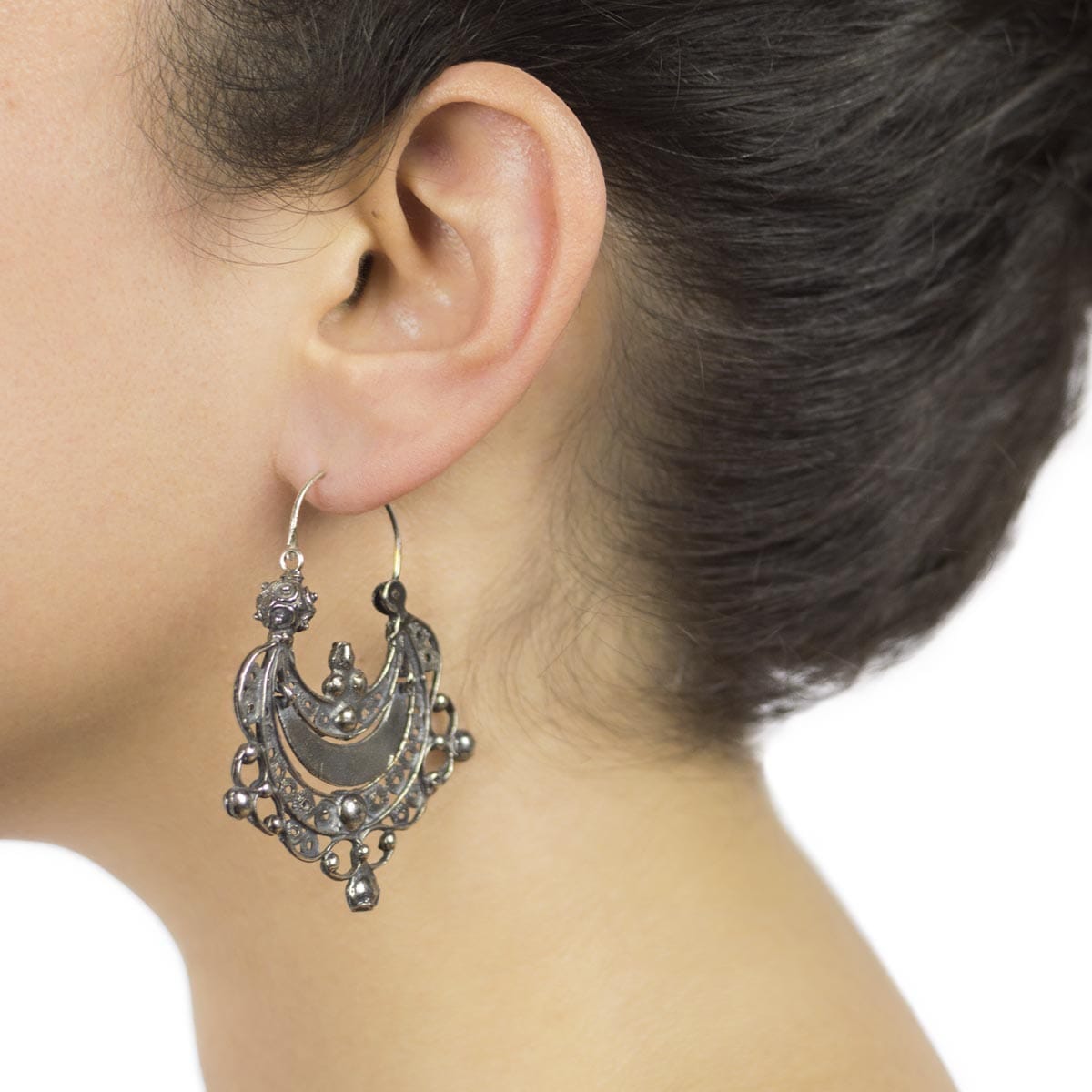 . Los pendientes extremeños son generalmente largos, con formas que recuerdan las cruces o los motivos vegetales.