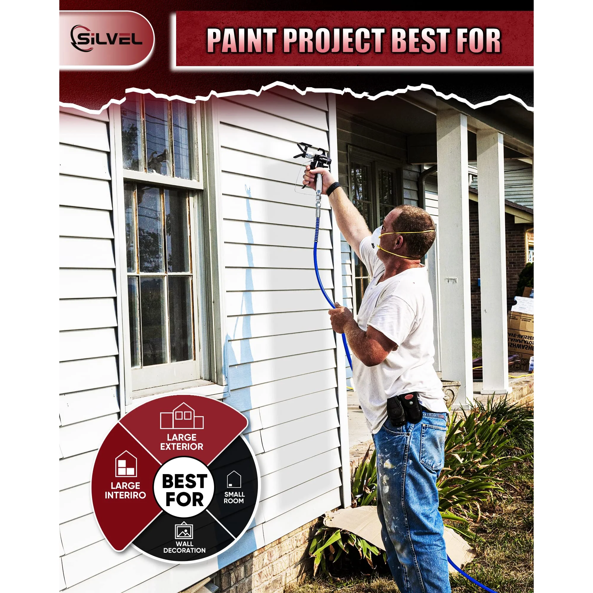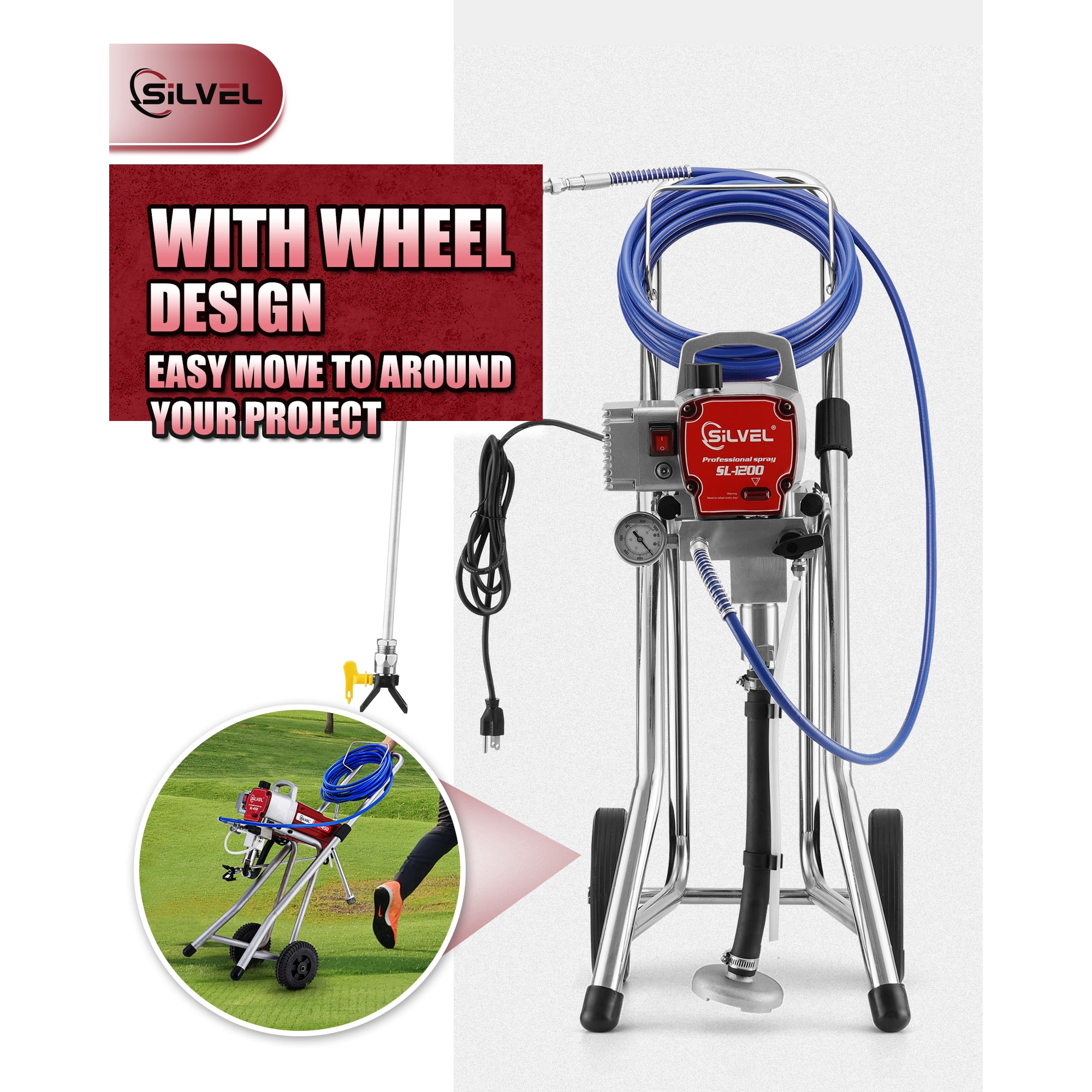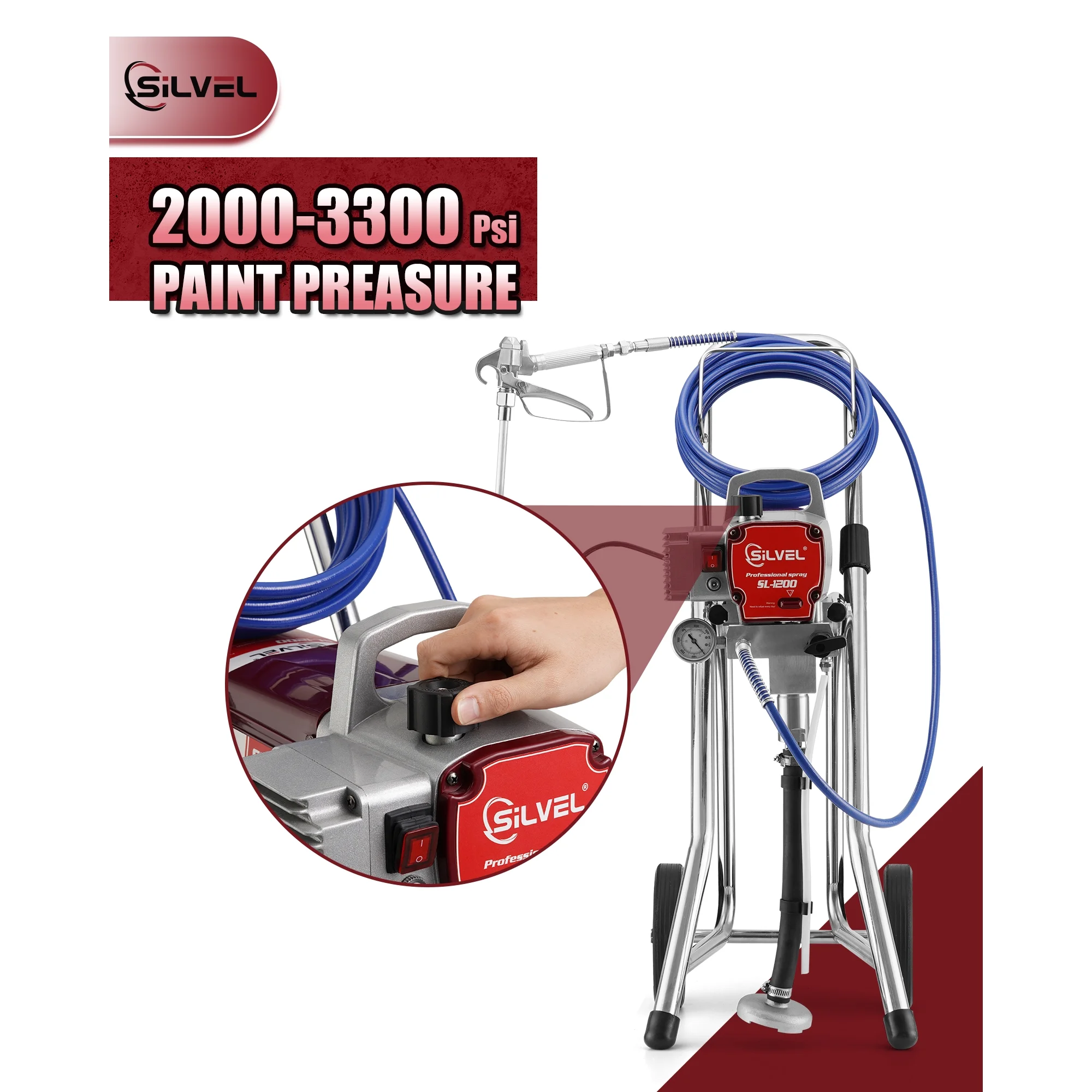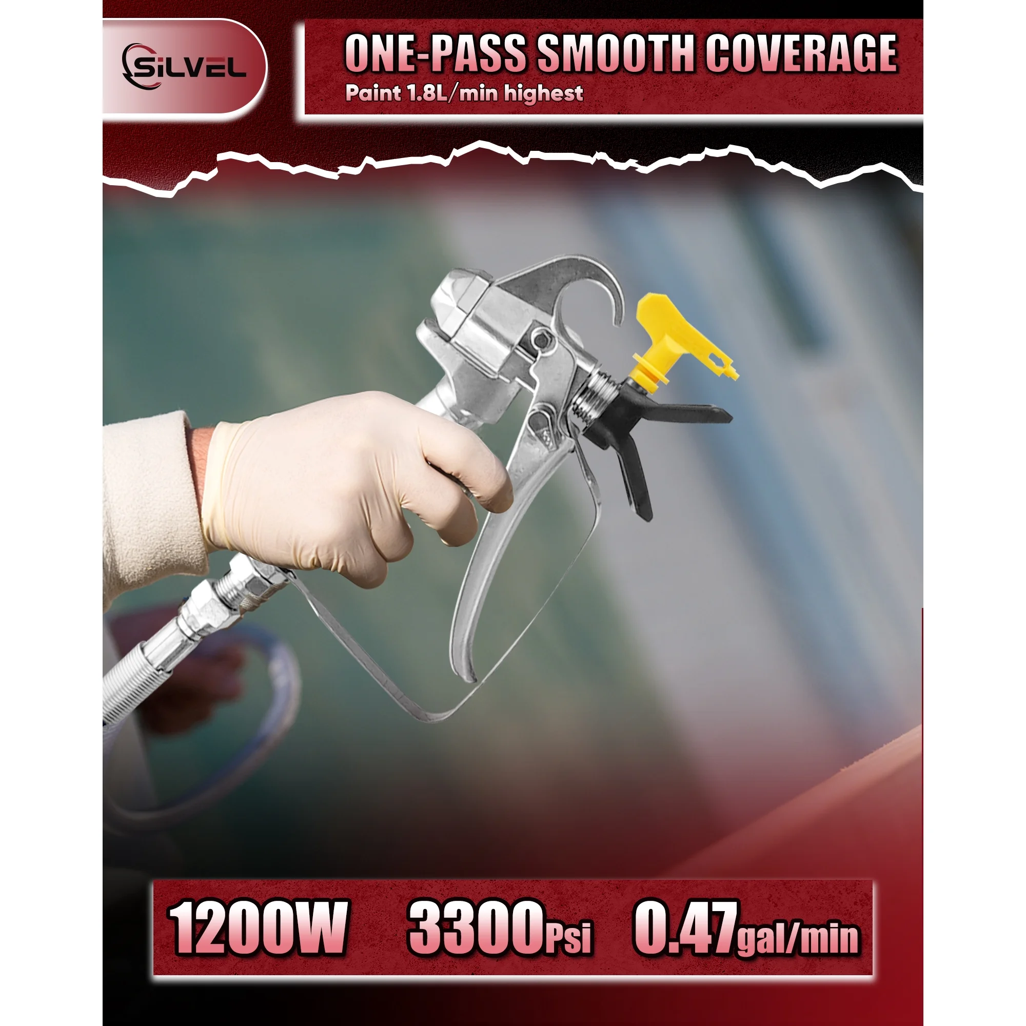 Este pulverizador de pintura Airless de mano SILVEL 1200W es una máquina eléctrica de alta eficiencia que ofrece resultados de calidad profesional con su presión de salida de 3300 psi y varilla de extensión.