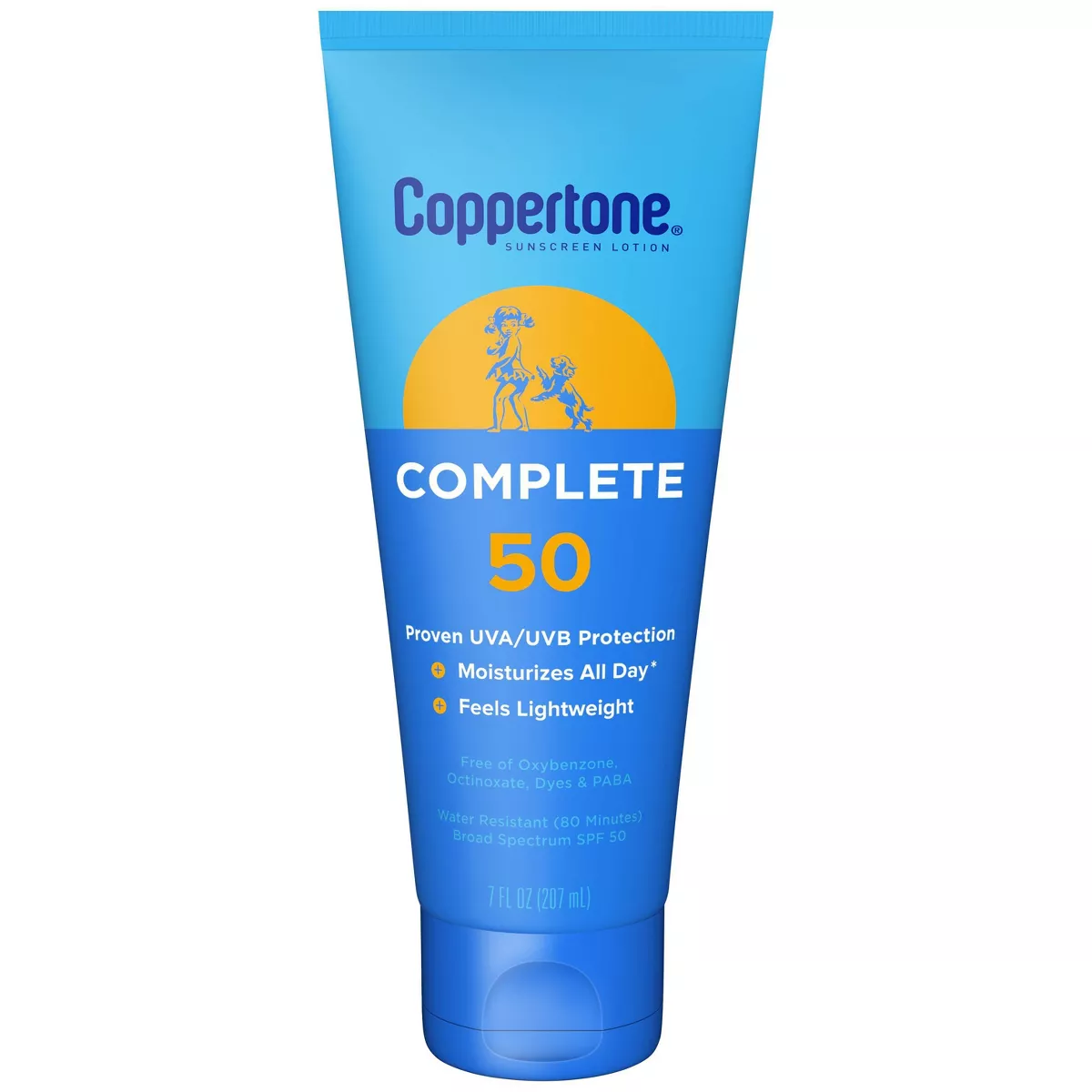 La loción de protección solar Coppertone Complete SPF 50 es resistente al agua (80 minutos) e hidrata todo el día
