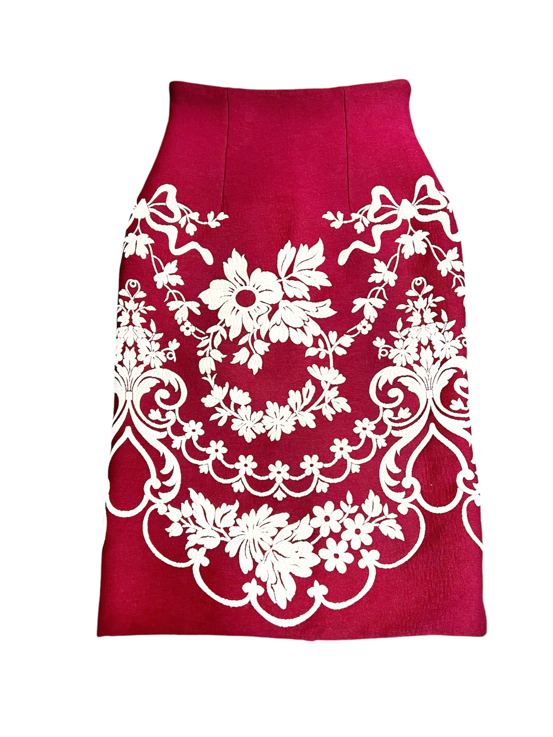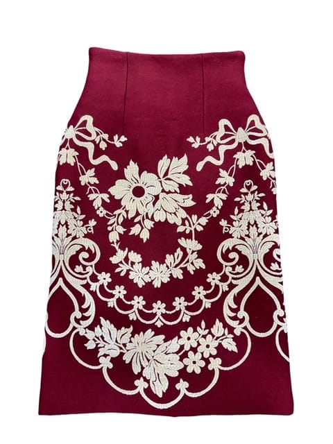 Se trata de una falda confeccionada en tejido grueso, adornada con motivos en relieve que se logran mediante una técnica de flocado.