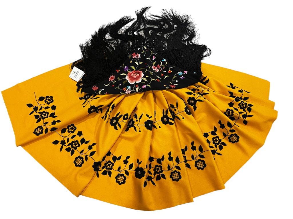 Las faldas andaluzas suelen llevar encajes y detalles dorados que realzan su belleza.