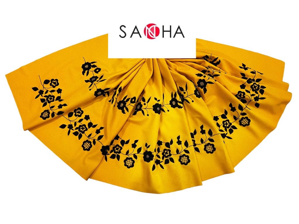 REFAJO FLOR PAÑO MOSTAZA BORDADO EN NEGRO