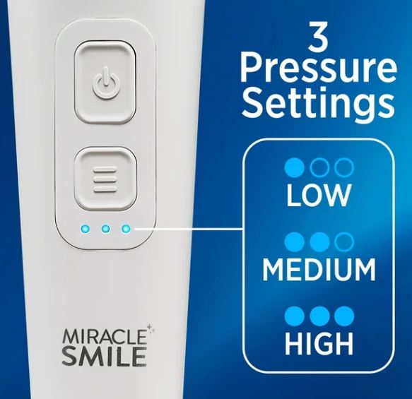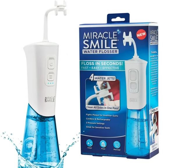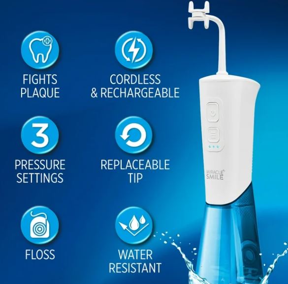 Miracle Smile, el nuevo y revolucionario irrigador dental que ayuda a usar hilo dental en toda la boca en segundos para lograr una sensación de limpieza en la boca y una sonrisa más brillante. El cabezal de uso de hilo dental en “forma de H”, pendiente de patente, con 4 chorros de agua específicos rodea cada diente para ayudar a enjuagar los dientes superiores, inferiores, frontales y posteriores y debajo de la línea de las encías, todo al mismo tiempo, en solo 10 segundos.