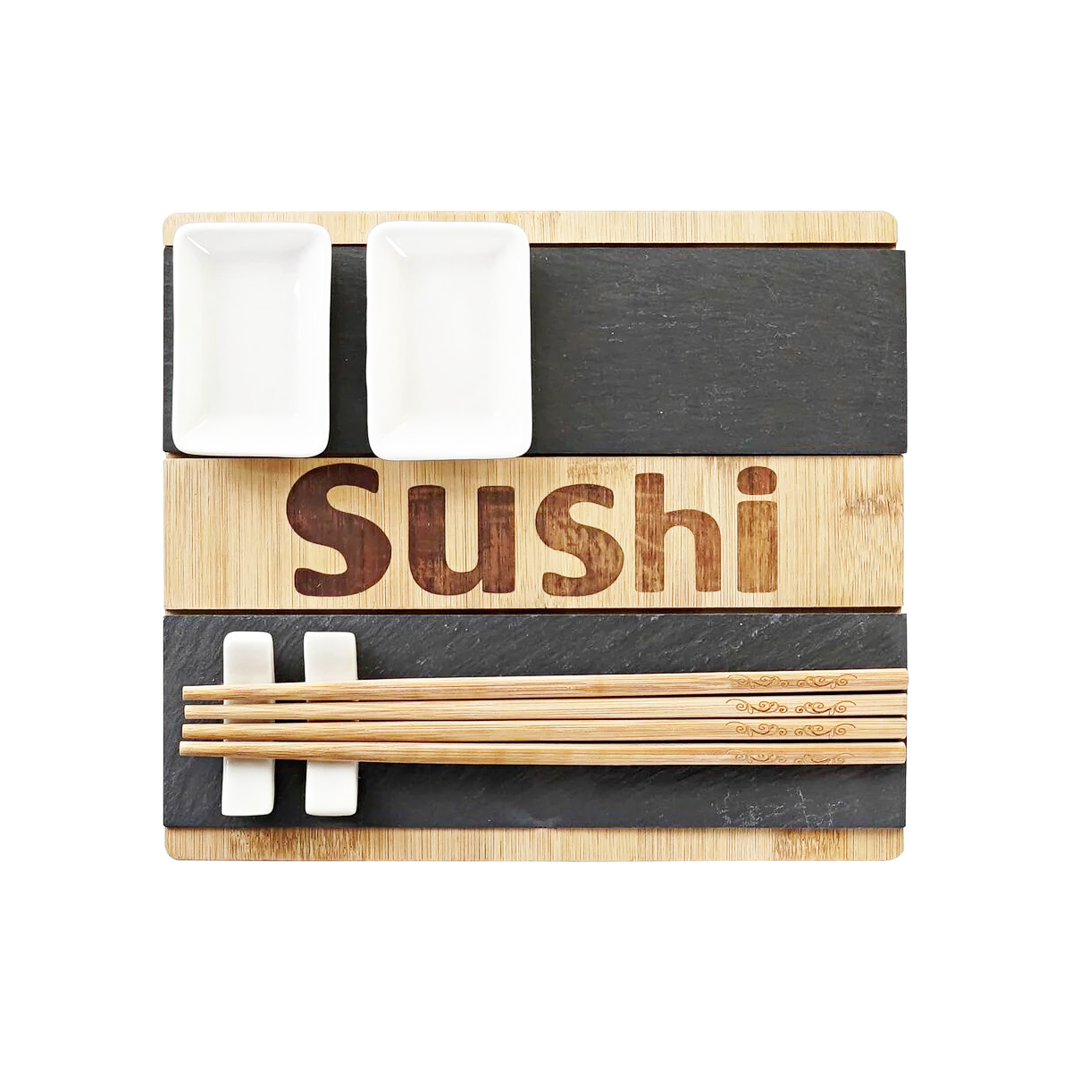 set table para sushi con partes en lajas, trae palitos , compotera ceramica y viene en caja