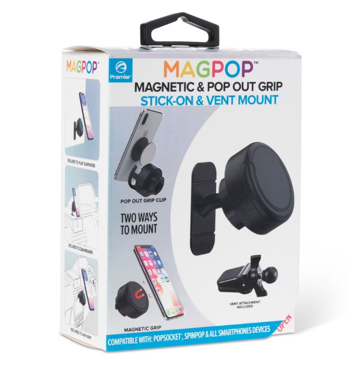 El soporte magnético Premier Mag Pop y Pop Grip se fija a cualquier superficie plana o rejilla de ventilación del vehículo. Este soporte es ideal para automóviles, oficinas, hogares y mucho más. Asegura el dispositivo del teléfono magnéticamente con su elección de agarre o imán. Este kit de montaje viene con una parte trasera adhesiva resistente y de alta calidad para el montaje adhesivo, así como con un resistente clip de ventilación. Con este fuerte imán, este soporte mantendrá tu teléfono seguro mientras conduces con las manos libres. Simplemente coloque su zócalo dentro del soporte, colapse el zócalo y encienda su unidad. Este soporte mantendrá tu teléfono seguro mientras conduces con las manos libres.
