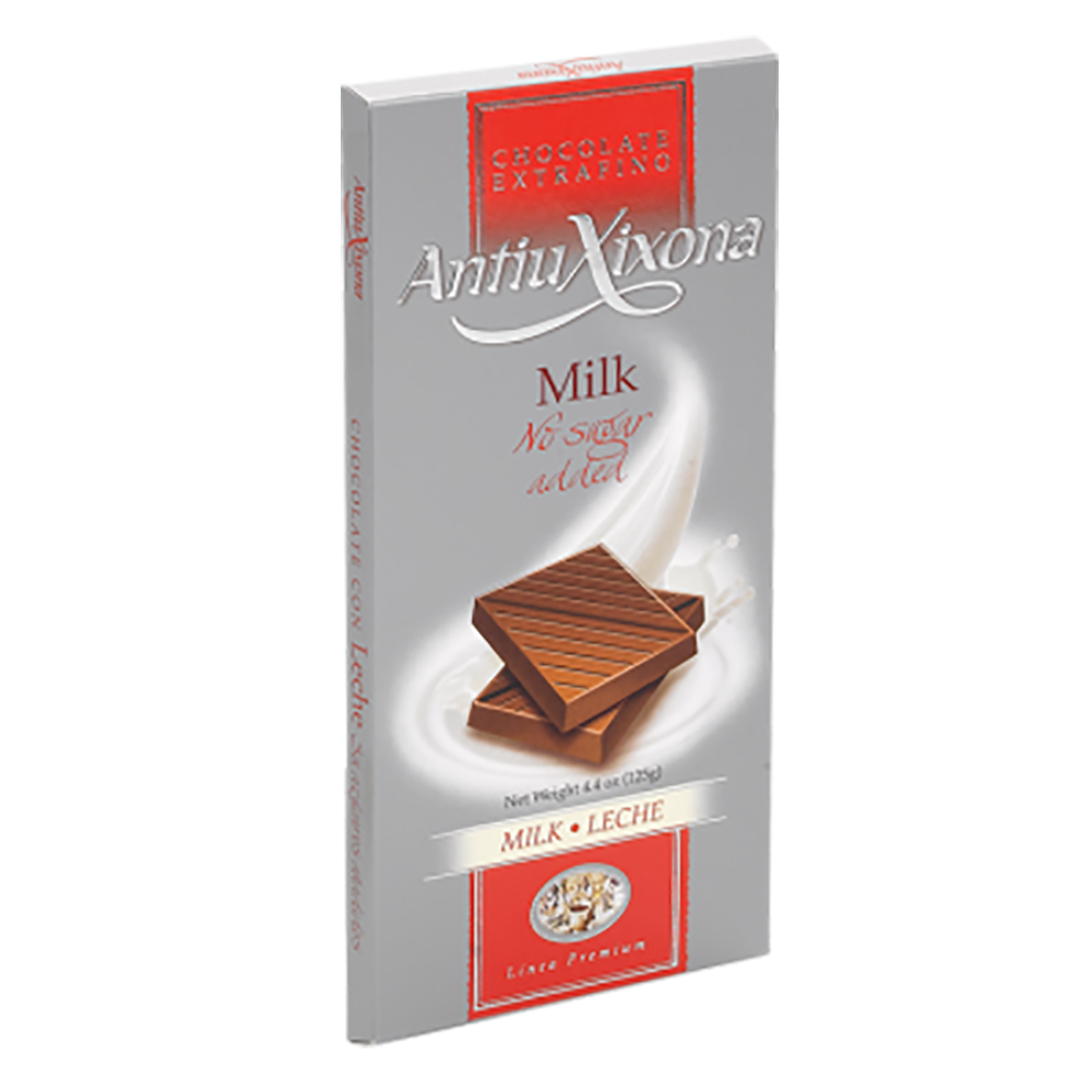 La tableta de chocolate con leche de Antiu Xixona tiene un toque cremoso en su interior. No contiene azúcares añadidos. Pertenece a la gama premium de chocolates extrafinos, con un sabor excepcional.