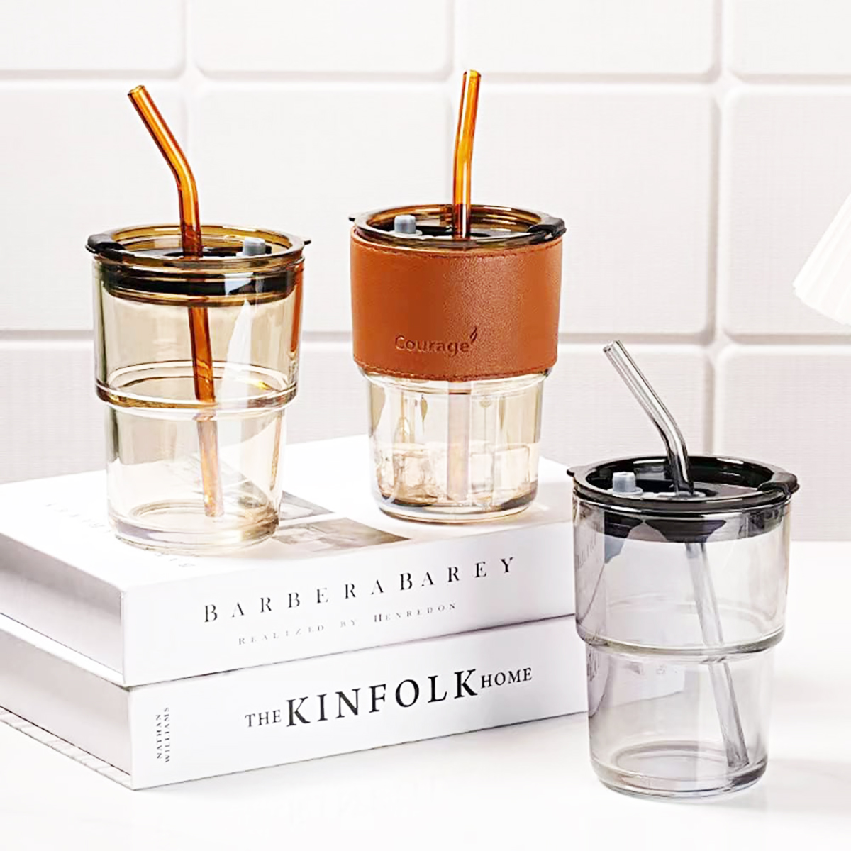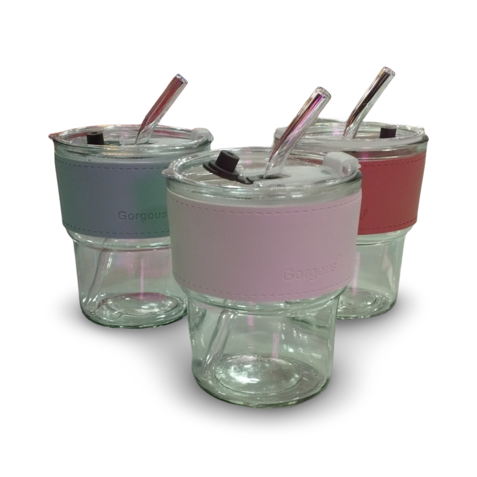 Vaso de vidrio con bombilla tapa y la faja es de cuero con sorbete