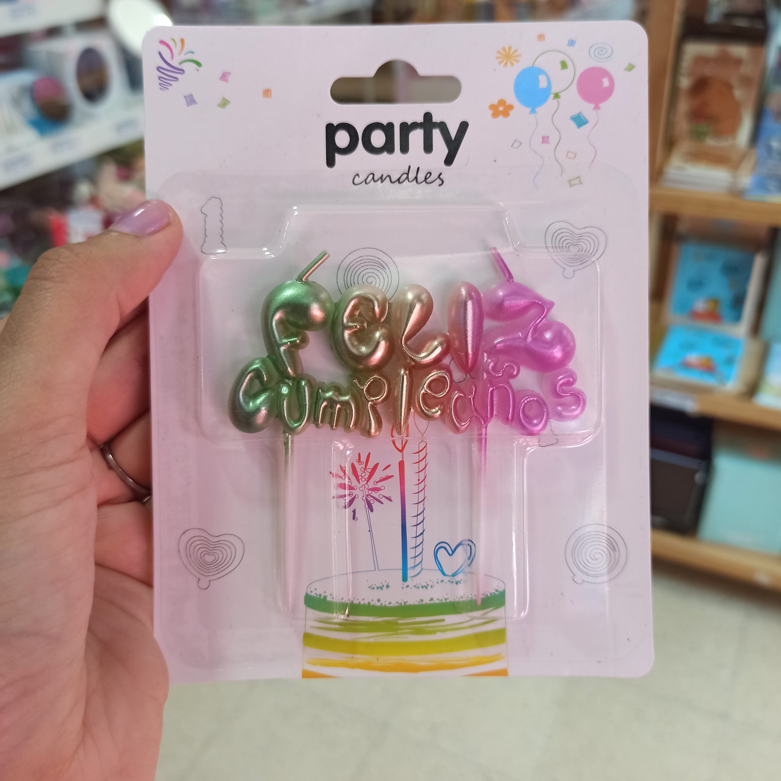 Vela “Feliz Cumpleaños” con dos mechitas y diseño decorativo.