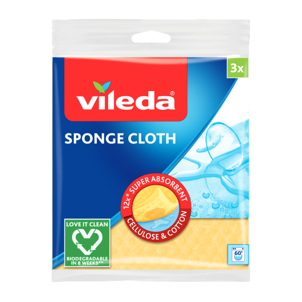 La esponja de Vileda limpia y seca las superficies fácilmente sin dejar rayas ni pelusas. Nuestros paños de esponja son 100% compostables y biodegradables en 8 semanas.