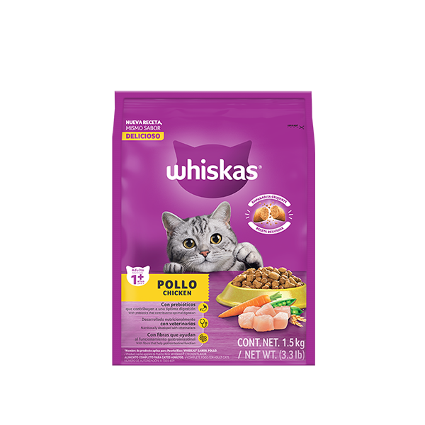 Whiskas Pollo combina nutrientes esenciales con irresistibles croquetas y crujientes empanaditas rellenas. Su fórmula contiene niveles adecuados de minerales que cuidan sus vías urinarias, Omega 6 para un pelaje brillante y aminoácidos esenciales para la salud de su corazón, cerebro y ojos.